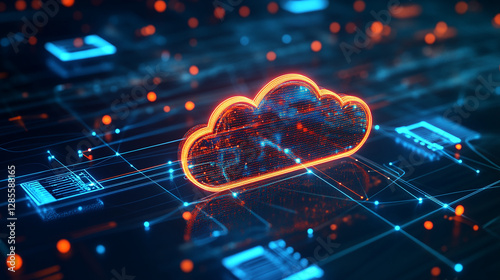 A glowing cloud icon connected to multiple devices, illustrating cloud-based data sharing, AI-driven services, and digital transformation.