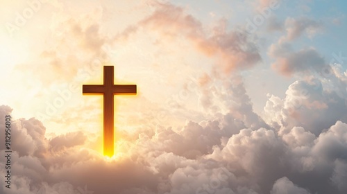 A glowing cross emerges from cloudy sky, symbolizing hope and faith. warm light contrasts beautifully with soft clouds, creating serene and uplifting atmosphere