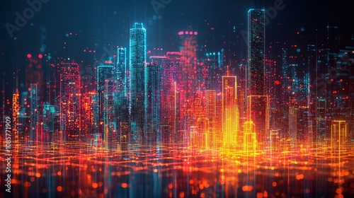 A glowing cyberpunk skyline with gradient waves of light weaving through its towering skyscrapers. Holographic projections and vibrant neon accents create a dynamic and futuristic cityscape.