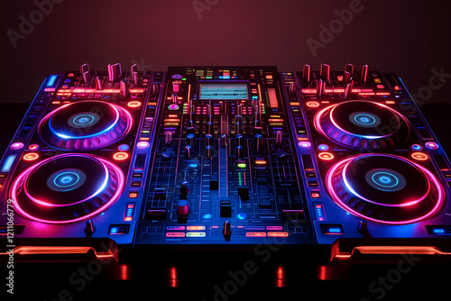 A glowing digital DJ mixing neon soundwaves on a radiant holographic console