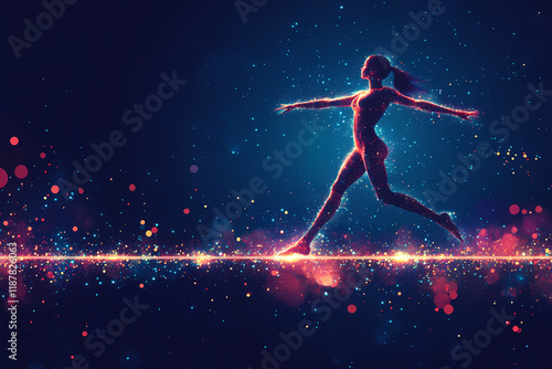 A glowing digital gymnast performing on a futuristic balance beam, symbolizing grace and technical perfection