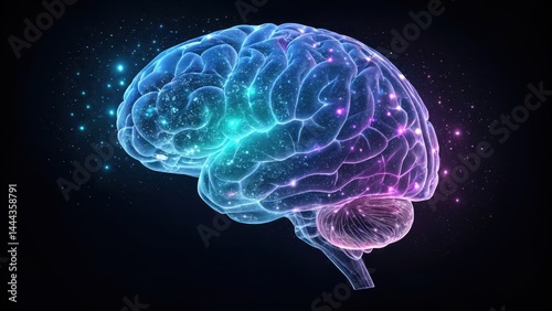 A glowing digital illustration of a human brain with vibrant colors and a cosmic, futuristic background.