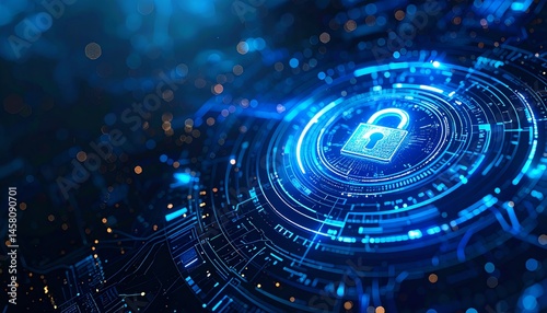 A glowing digital padlock icon at the center of a blue, futuristic circuit, symbolizing cybersecurity and data protection.