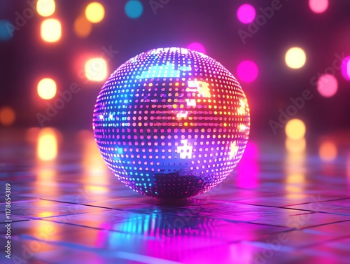 A glowing disco ball with colorful lights reflecting on a tiled surface.