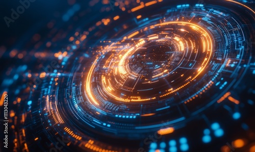 A glowing, futuristic circular interface with vibrant blue and orange lights, representing advanced technology and data visualization.