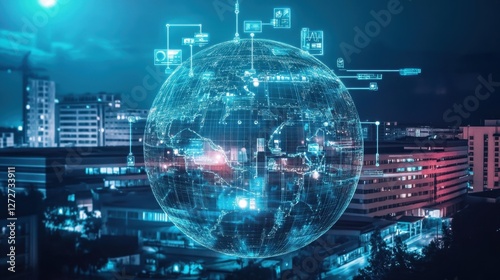 A glowing globe representing global health insurance, with digital connections and holographic access points.