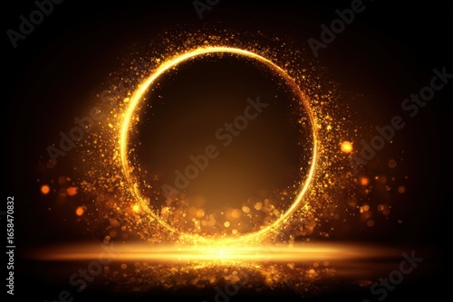 A glowing golden ring surrounded by sparkling particles on a dark background, creating a magical and radiant atmosphere