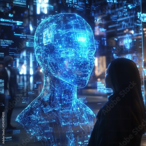 A glowing holographic human figure stands in a futuristic digital interface, surrounded by data streams, as two observers analyze its structure in a high-tech, sci-fi environment