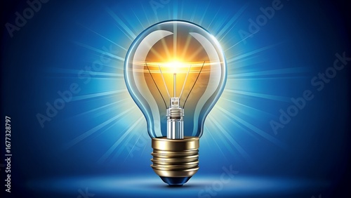 A glowing incandescent light bulb on a vibrant blue background with radiating light rays, symbolizing innovation and bright ideas