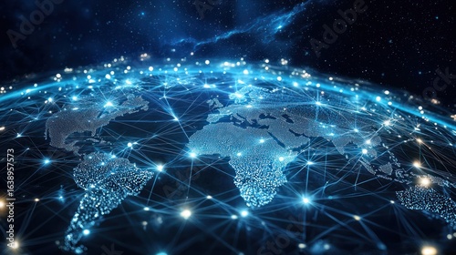A glowing, interconnected globe with a map of the world, representing global connectivity and technology.