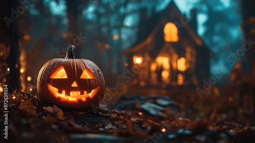 A glowing jack o lantern sits in foreground, surrounded by autumn leaves, with mysterious, illuminated house in background. scene evokes spooky Halloween atmosphere