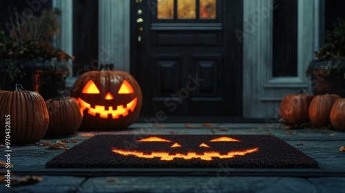 A glowing jack-o'-lantern sits on a porch with a lit-up welcome mat in front of a dark wooden door.