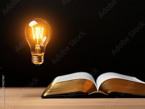 A glowing light bulb above an open book symbolizes inspiration and creativity in learning and knowledge.
