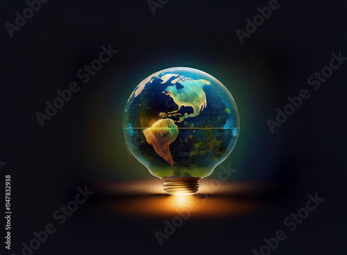 A glowing light bulb contains a miniature Earth, symbolizing global energy and environmental awareness. The warm light casts a soft glow on the dark background.