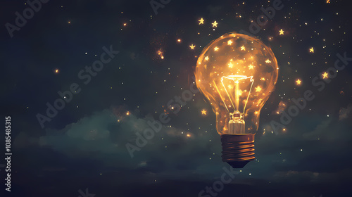 A glowing light bulb filled with shimmering stars, casting a soft ethereal glow, symbolizing dreams and infinite possibilities, surrounded by a serene night sky. Infinite. Illustration