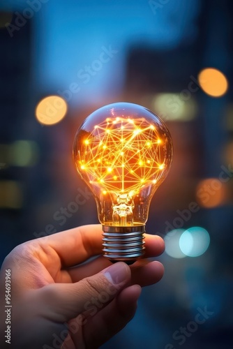 A glowing light bulb held by a hand, symbolizing creativity and innovation against a blurred urban backdrop.