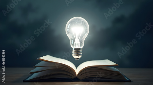 A glowing light bulb hovering over an open book. A concept of knowledge, ideas, innovation, and learning. The power of education.