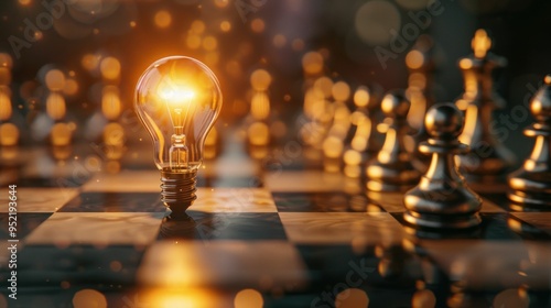 A glowing light bulb placed on a chessboard, symbolizing creativity and strategy amidst chess pieces, illuminated by warm light