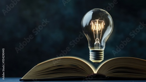 A glowing lightbulb hovers above an open book, symbolizing knowledge, ideas, and inspiration. The warm light illuminates the pages, creating a captivating image.