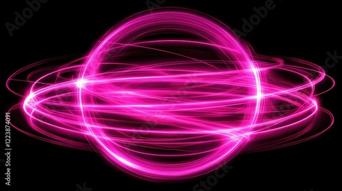 A glowing neon sphere in magenta, with radiating light trails forming abstract curves around it.