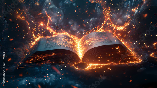 A glowing open book with sparks flying out. Unraveled Dimensions. Illustration