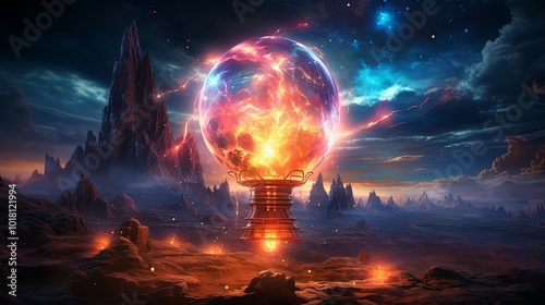A glowing orb, a fiery sphere, hovers above a landscape of rugged peaks and rocky plains, radiating energy and illuminating the night sky with a mystical glow.