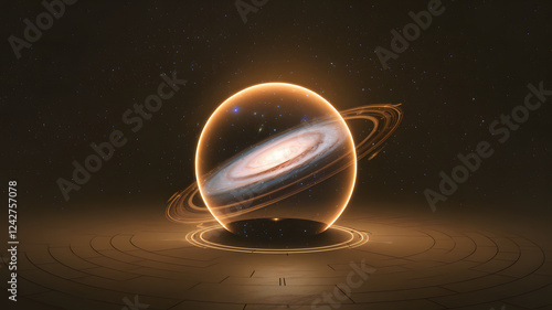 A glowing orb containing a miniature galaxy, rotating slowly in a silent void.