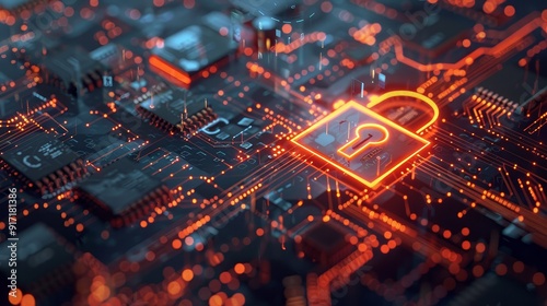 A glowing padlock symbol sits on a circuit board, representing the importance of cybersecurity in protecting sensitive data. The image symbolizes technology, protection, safety, privacy, and digital s