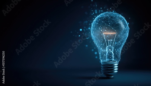 A glowing, polygonal lightbulb on a dark background, radiating energy and innovation. Particles emanate from it, suggesting creativity and brilliance