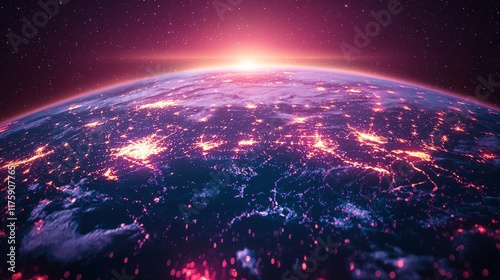 A glowing purple Earth surrounded by intricate digital lines and network connections in space, symbolizing technological innovation