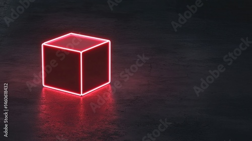 A glowing red neon cube sits on a dark textured surface, casting a vibrant reflection and creating a futuristic atmosphere.