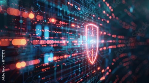 A glowing red shield icon representing a cybersecurity firewall protects a digital network of data lines and nodes