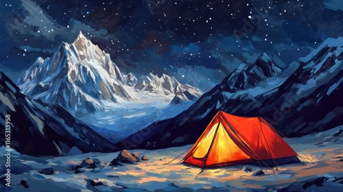 A glowing red tent illuminates a dark mountain landscape under the night sky.