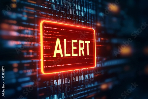 A glowing red warning icon with text "ALERT" inside, overlaid on a dark digital interface filled with code lines, symbolizing detected threats in a cybersecurity system.