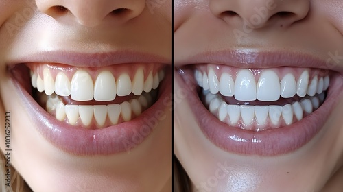 A glowing review from a teeth whitening patient, with before-and-after images illustrating the shift from yellowed teeth to a flawless, pearly white smile