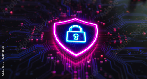 A glowing shield emblem is the focal point on a futuristic circuit board. The shield has a vibrant pink neon outline and contains a bright cyan padlock icon.