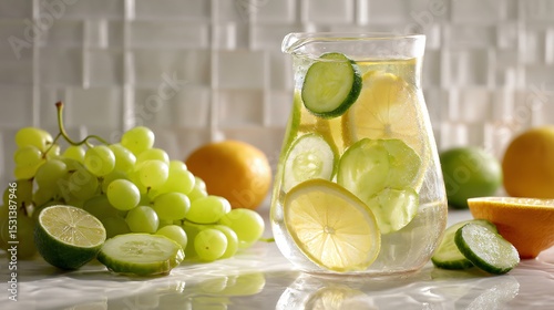 A glowing spa scene with infused water, green grapes, citrus and cucumber slices, minimal white tile
