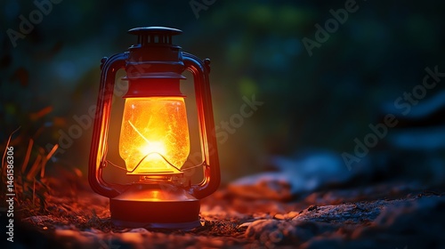 A glowing vintage lantern emits warm light, illuminating a natural outdoor setting at dusk.