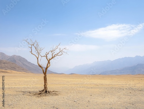 A gnarled tree stands in a barren expanse, drought symbolizing economic turmoil, hues of muted earth reflecting the stark reality of struggle.