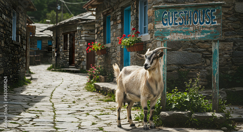 A goat stands in front of a guesthouse in a rural village, surrounded by stone buildings and mountain scenery, creating a peaceful and traditional travel destination
