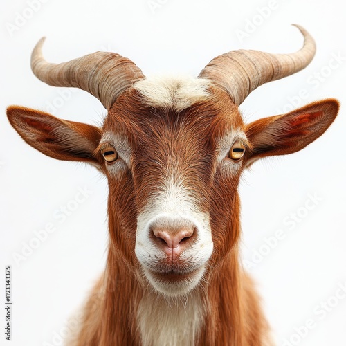A goat with prominent horns gazes directly at the camera, showcasing its unique features and inquisitive nature in a captivating manner.