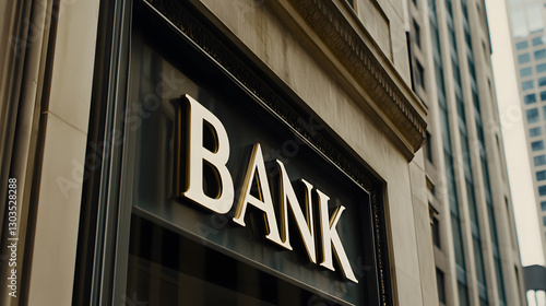 A gold colored sign that says "BANK" on the front of a large building, set against the backdrop of a city skyline. The financial institution stands tall, a solid structure.