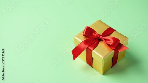 A Gold Gift Box with a Crimson Ribbon Bow on a Pale Green Background, Ready for a Special Occasion
