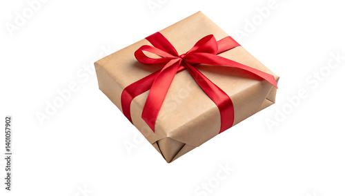 A gold gift box with a red ribbon and bow, isolated for any holiday celebration surprise