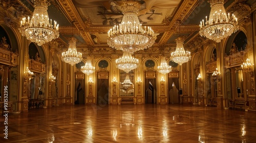 A golden ballroom lit by chandeliers, ready for an elegant event