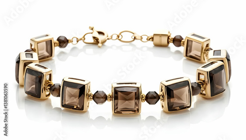 "A Golden Bracelet Featuring Square-Cut Smoky Quartz Gemstones on a White Background" Description: This elegant golden bracelet showcases square-cut smoky quartz gemstones, set delicately against the