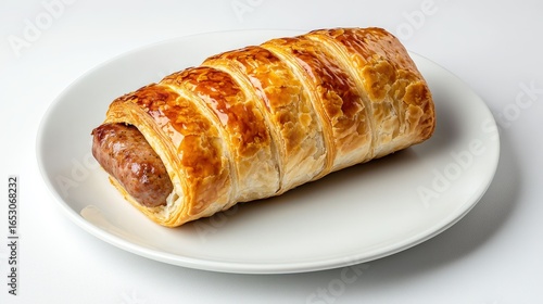 A golden brown sausage roll with flaky pastry sits on a clean white plate, its savory filling peeking out from the ends, ready to be enjoyed as a tasty snack.