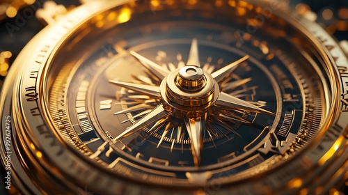 A golden compass pointing towards true north, symbolizing direction and purpose, golden compass, guidance and clarity