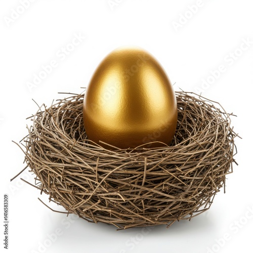 A golden egg rests peacefully inside of a bird's nest on a plain white surface in a studio shot