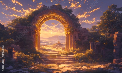 A golden magical portal on an ancient island connected to an ancient city from a fairy tale
